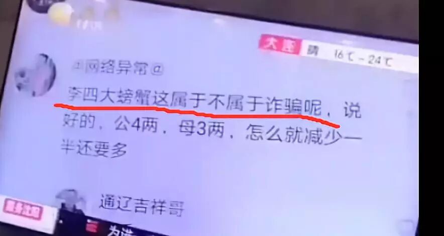 天津李四的螃蟹风波持续发酵居然上了电视,昨天辽宁卫视经济频道报道了一则名为“看快手直播买大闸蟹,缺斤少两品质差”的消息。一位声称在快手购买螃蟹的女士声称,在收到货后发现螃蟹斤两不足,而且品质不好。新闻在播放主播直播视频的时候,画面是天津李四的PK回放。