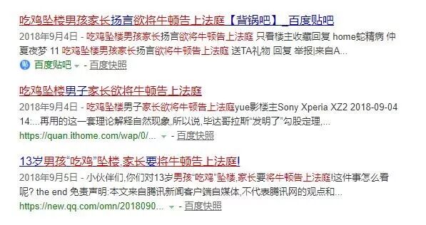比如去年这个时候,网上曾经流传的一条“玩网络游戏坠楼男孩家长欲将牛顿告上法庭”的消息,现在还能在网上搜索到。