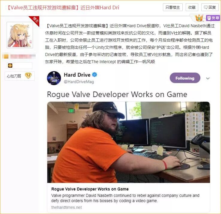 几个月前,一则“V社员工因偷偷开发游戏违背公司的规定而被解雇”的消息在贴吧论坛多有转发:
