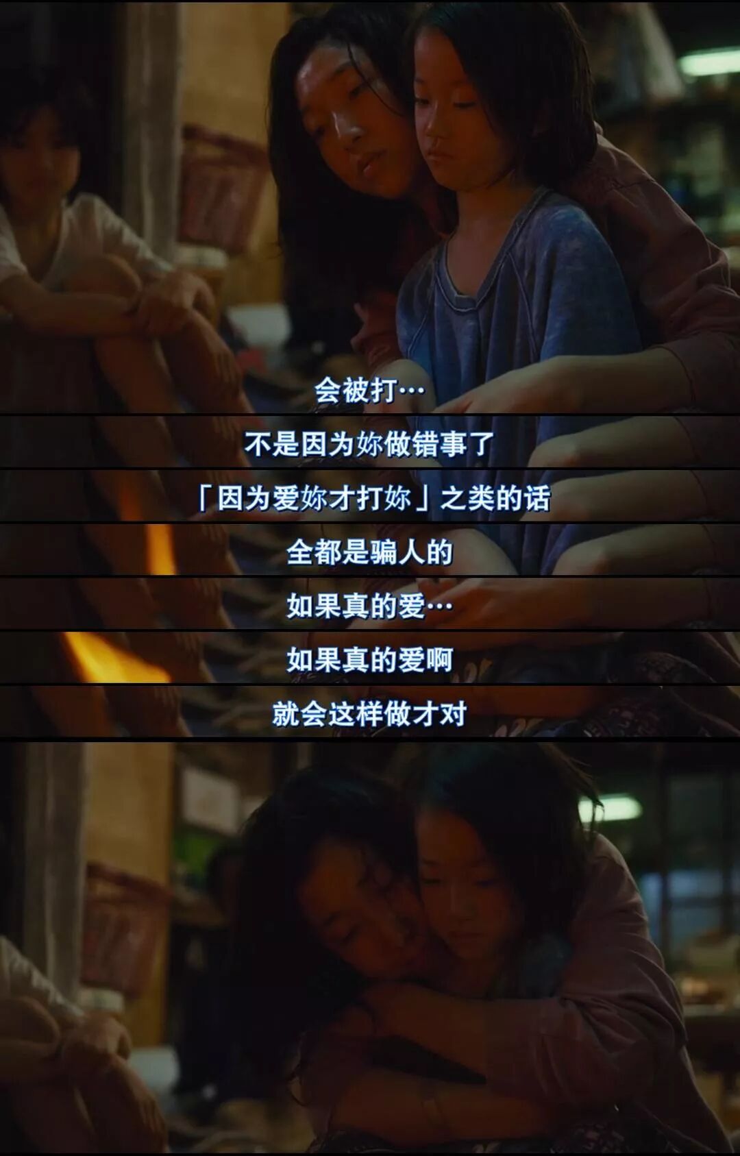 《小偷家族》中,信代听闻由里被父母打,用拥抱安慰她。