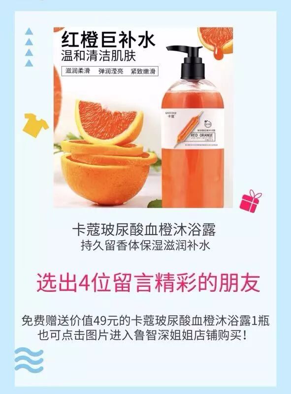 选出4位留言精彩的读者,赠送每人1瓶价值49元的卡蔻玻尿酸血橙沐浴露。