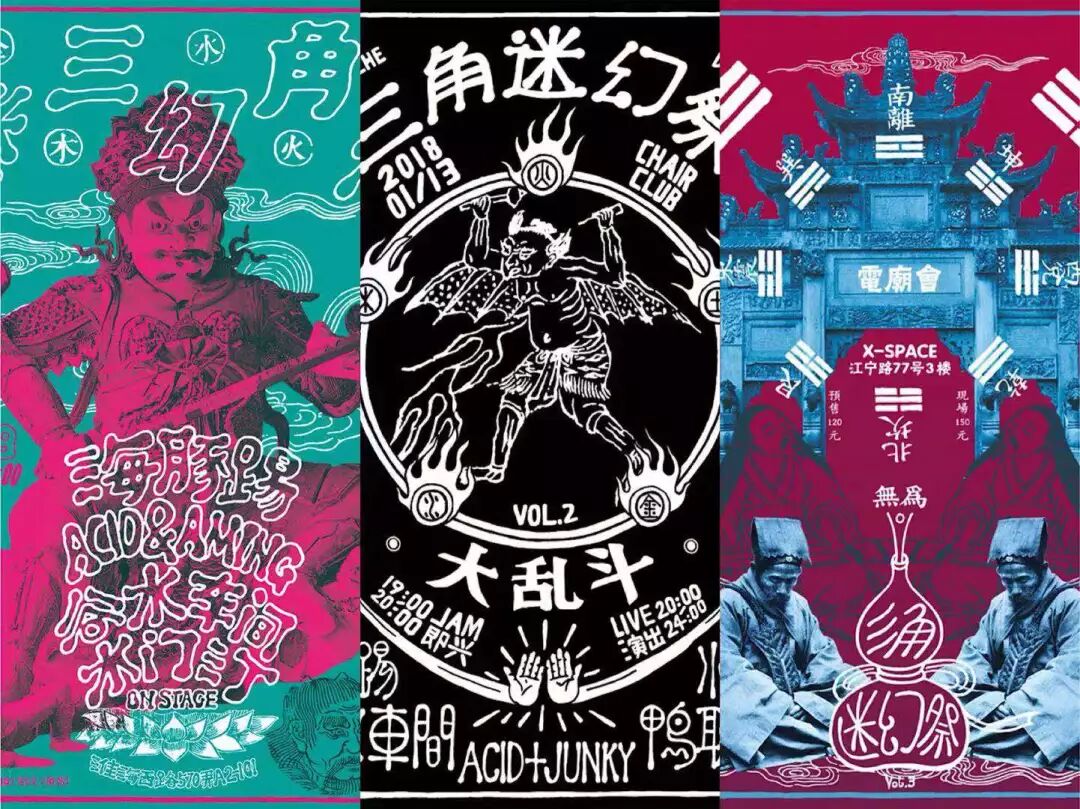 你能从三届 “三角迷幻祭” 的海报中看到大量的道教元素:八卦图、道士的形象,包括一些宗教术语,都被鲜明地呈现在徐迪设计的海报中。这个东汉末年产生于中国本土的宗教,在清朝初年传入毛南族聚集区后逐渐成为了毛南族的主流宗教。