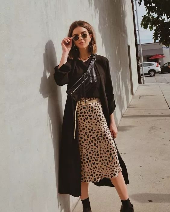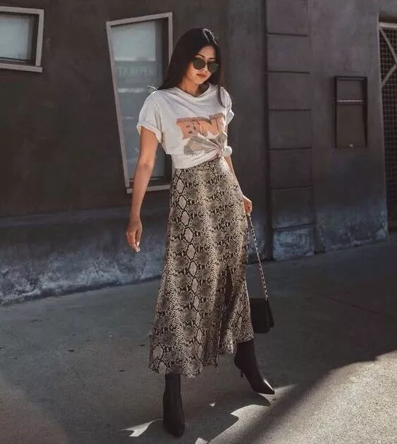 动物纹半裙的街拍出镜率特别高,真的是怎么穿怎么好看,但是尽量选择A字型的裙摆,不要选择包臀款哦~