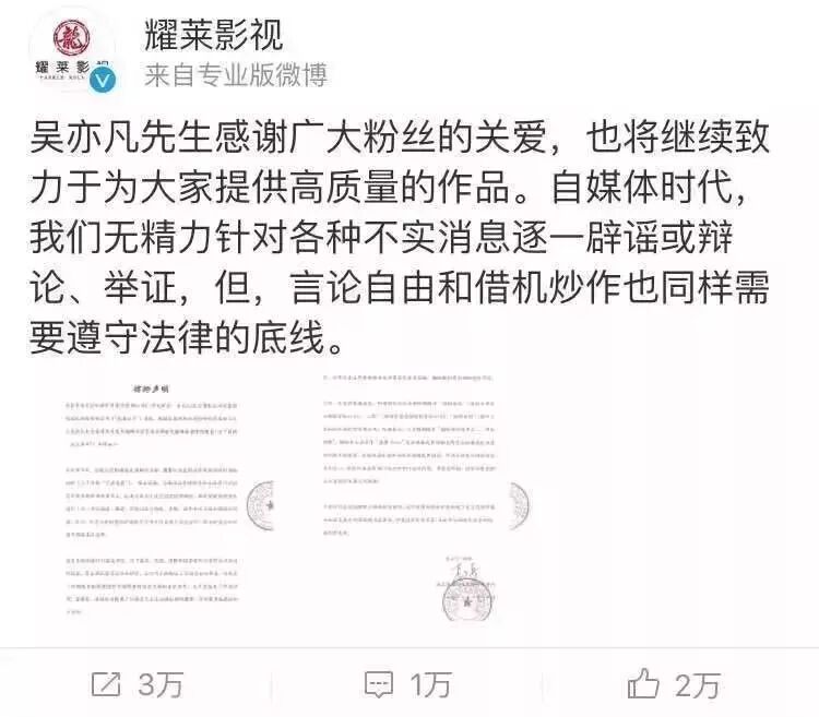 2016年吴亦凡卷入桃色事件,闹得沸沸扬扬。关键时刻还是綦美合老爸给力,出手签下负面新闻缠身的吴亦凡,以“耀莱影视”的公司为他发表了法律声明。