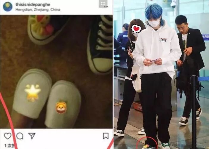 最重要的是,这个疑似綦美合的小号动态中出现了一张酒店拖鞋和王一博同款的太阳花帆布鞋的合影照片,种种巧合都为这段绯闻添“锤”。▲照片里一个穿着酒店拖鞋的女生对面站着一个男生,男生脚上穿着一双带有太阳花的帆布鞋。将图片放大调亮之后,这双鞋的颜色是墨绿色,好巧不巧王一博就有这样一双墨绿色的太阳花帆布鞋。定位为浙江横店,时间则是去年6月,也就是《陈情令》拍摄期间。