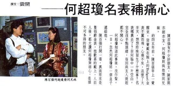 再看时间离我们近一点的80年代香港,“追星界的标杆”那必须是“赌场公主”何超琼。不仅拥有美貌、金钱、智慧,还能和英俊帅气的小生谈笑风生,关系好到被媒体传绯闻。▲和何超琼传过绯闻的陈百强、张国荣,这两大帅哥哪个女孩能不妒忌呢?当时的何超琼还是热爱艺术的文艺女青年,非常欣赏才华横溢的音乐才子陈百强,1981年他们在兰桂坊偶遇相识,自此便结下了不解之缘。▲一次无线音乐颁奖典礼上,镜头正好带到陈百强、何超琼两人在台下窃窃私语,嘴角带笑,令港媒炸开了锅,第二天头条立刻爆料两人拍拖。但他们只认彼此是知己、否认曾恋爱。陈百强以一副有自知之明的姿态表示:“哪里轮得到我”。久而久之,媒体只好写他们两小无猜、情同兄妹。陈百强曾遗失过一只价值不菲的名表,何超琼二话不说就买了只一模一样的送给他。