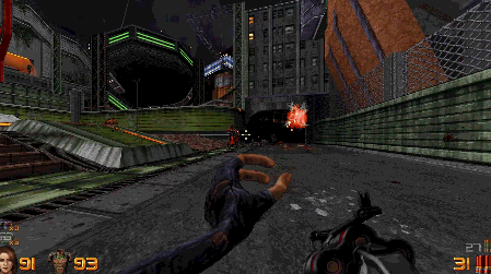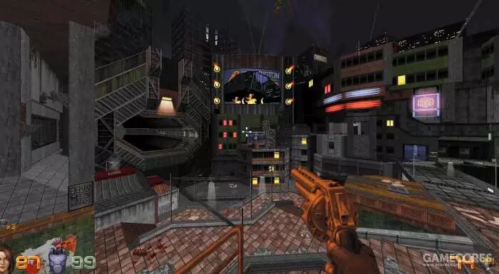 你看,id 当年喜欢黑暗、重金属和 B 级片这些东西,他们做了一堆这种风格的游戏,也直接造成了90年代大多数同类作品乍看上去都那么“负能量”。而《毁灭公爵 3D》虽然也黄暴,但是相比来说简直就是小清新的代表了。