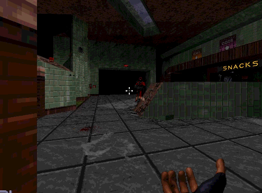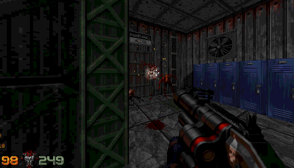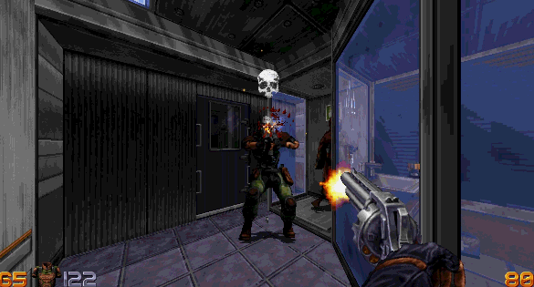 我没法解释这里头的技术因素,不过直觉上我认为这明显是继承了《毁灭公爵 3D》的特性。Build引擎的霰弹枪实际上并不能造成类似《DooM》那种集群散射伤害,虽然在动画上它表现出的是一堆弹丸,但实质上你可以将其视为着弹点会慢慢扩散、命中判定较大的步枪。