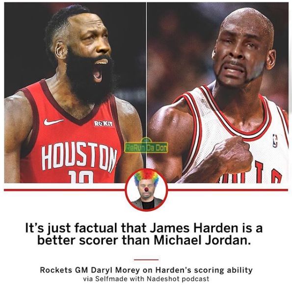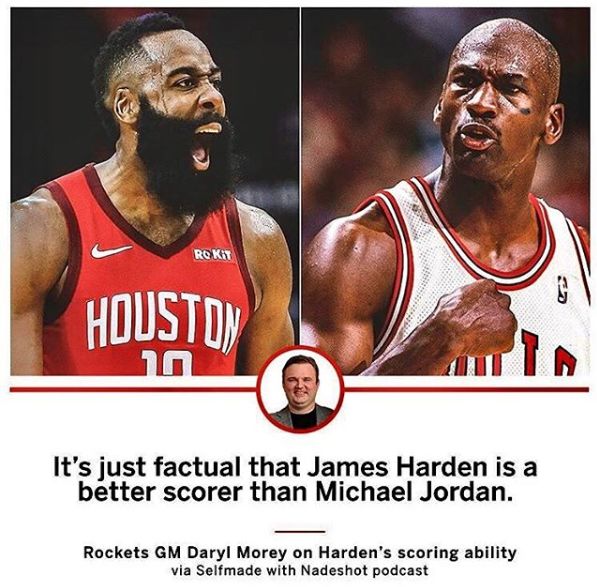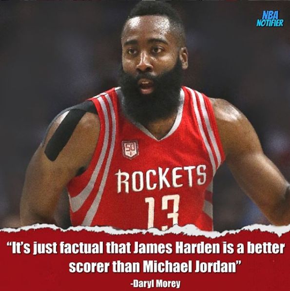 火箭队总经理莫雷总是支持很他的球员,但是近阶段他在赞扬哈登时走到了一个新的极端。“事实上,詹姆斯哈登是一个比迈克尔乔丹更好的得分手,”莫雷在上节目时说道。