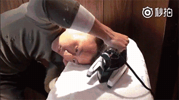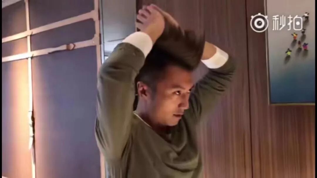 性感霆锋,在线做头。他分享了一则自制发型的视频,先预热熨斗,再把头放下来,左右均匀按压,使其受热均匀。