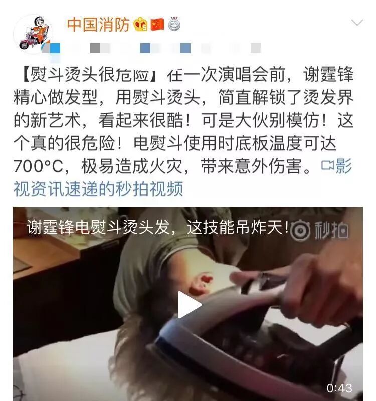 后有谢霆锋被中国消防@过,原因是“做头发”。