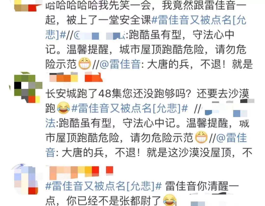 有点惨,但莫名想笑。评论和转发都在看热闹:“道路千万条,安全第一条。我和雷佳音一起上了安全课”、“您还没跑够吗?”。
