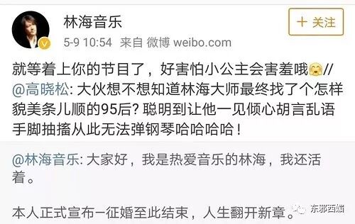 去年,曾为《大明宫词》谱曲的60后著名音乐人林海,在微博上公开征婚。高晓松踢爆征婚结果:林海找了个貌美条儿顺的95后。