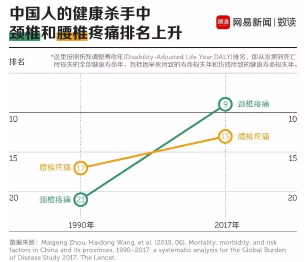 在用于衡量疾病带来健康寿命损失的伤残调整寿命年(DALY)排名中,从1999年到2017年,颈椎疼痛从第21名前进到第9名,腰痛也从第17名爬升到13名。
