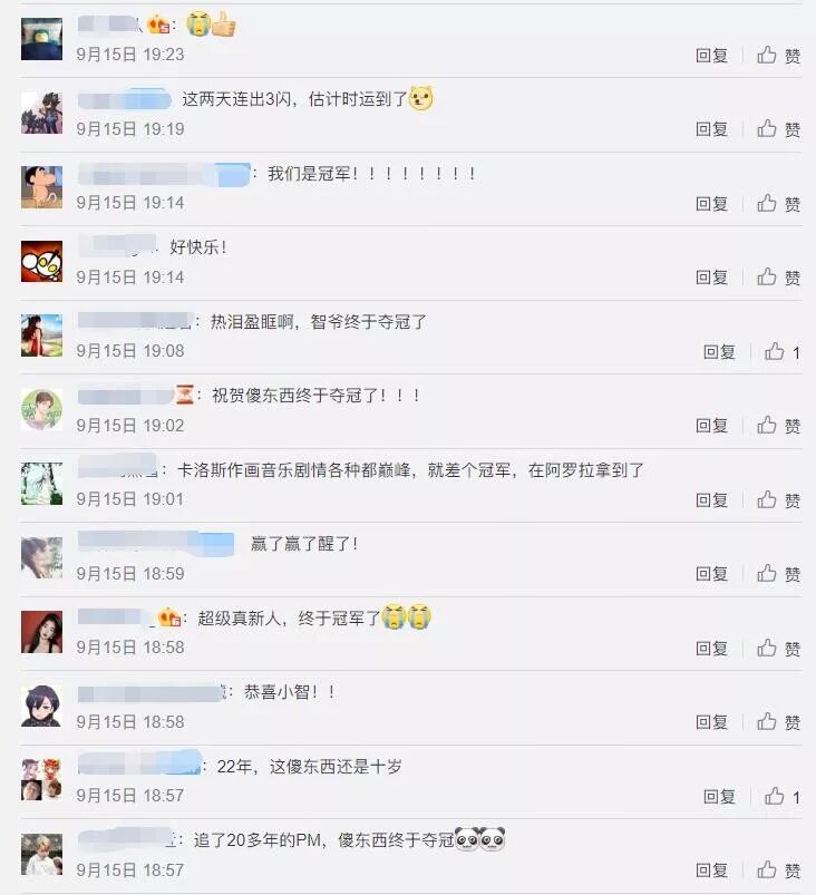 这些恭喜小智的消息下面,激动的粉丝喊道:我们是冠军!而吃瓜群众也忍不住撂下一句:“恭喜啊,终于夺冠了,我的青春结束了。”