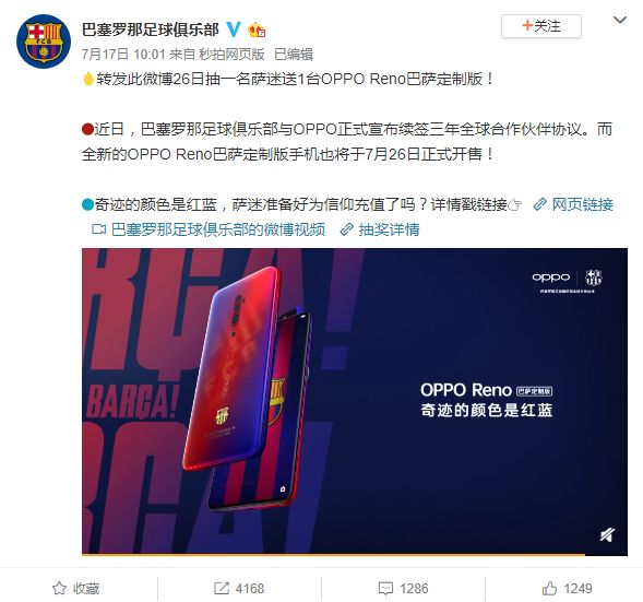 巴塞罗那与OPPO续约,合作推出了全新的巴萨定制版手机。奇迹的颜色是红蓝,很好地契合了巴萨的文化。为了给球迷送福利,巴萨官博推出了抽奖活动,转发破4000。