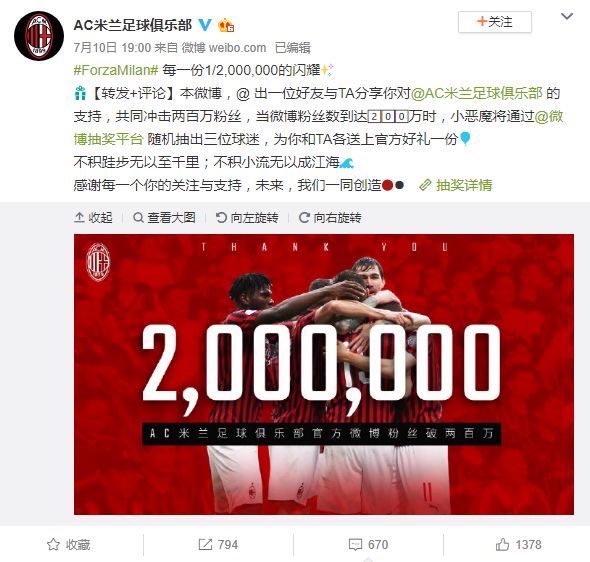 AC米兰官博,冲击两百万粉丝,当粉丝数达标时,会随机抽出三位幸运球迷送上礼物。截止目前,AC米兰官博粉丝已达到216万,紧追尤文图斯。