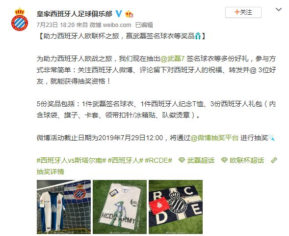 在欧联杯开战之前,西班牙人官博推出了内容丰富的抽奖活动,留下对西班牙人的祝福,即可参与抽奖,其中包括武磊签名球衣。活动也得到了众多球迷响应,西班牙人成为皇马巴萨之后,西甲联赛最受关注的球队。