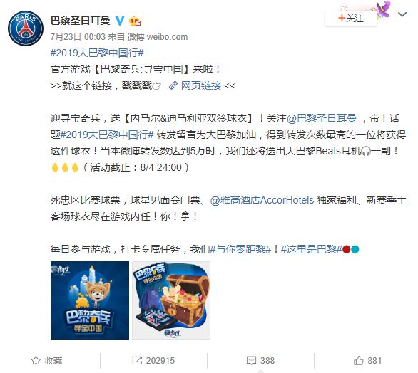 在巴黎中国行期间,推出官方游戏巴黎奇兵:寻宝中国,在所有俱乐部中显得极为出彩,将线下赛事与线上游戏相结合,可调动球迷参与度。此外,转发留言为大巴黎加油,还将送出抽奖礼品。这条微博的转发破20万,成为当月微博最热内容。