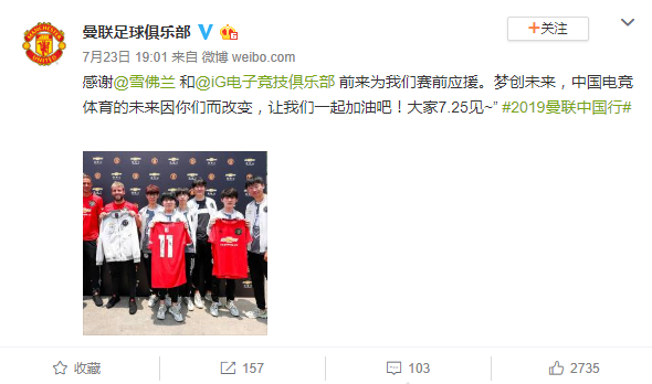 这是一次成功的“出圈”,在中国行期间,赞助商雪佛兰及IG战队前来为曼联应援。由于IG本身就有较多粉丝,电竞爱好者和足球迷部分重叠。最爱的电竞战队和最爱的球队同框,对于不少球迷来说,新鲜并且兴奋。