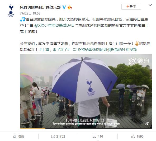 由X玖少年团谷嘉诚,与热刺球迷们共同录制了热刺官方中文助威歌曲。百合怒放,战歌嘹亮,荣耀终归白鹿巷。同时,也推出了MV,转发可赢取热刺上海行门票。