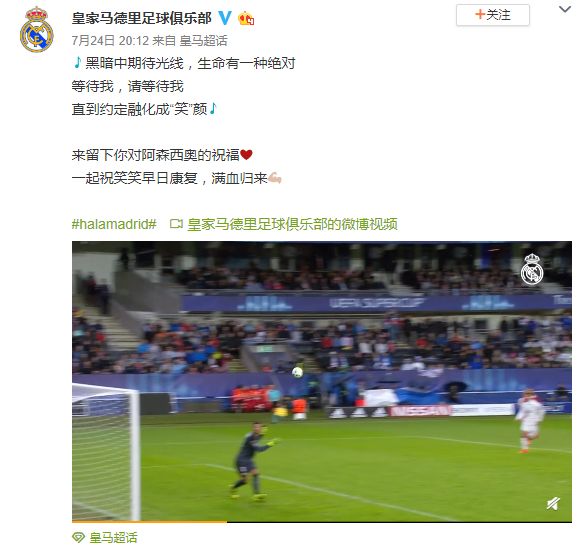 在夏季赛中,阿森西奥十字韧带重伤,将伤缺6-8个月。皇马官博推出了阿森西奥的高光集锦视频,并向球迷们征集祝福,一起祝笑笑早日康复,满血归来。