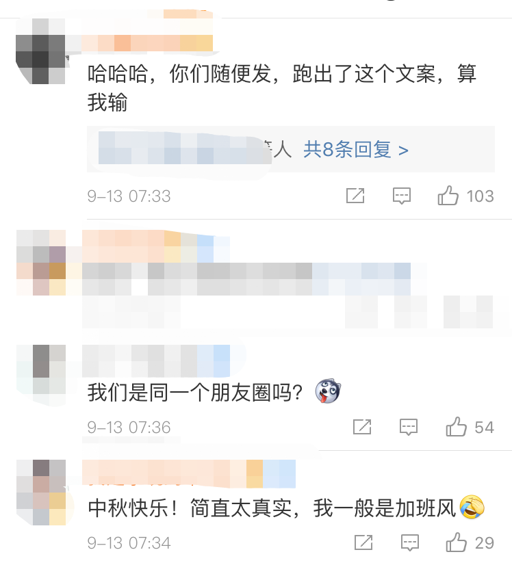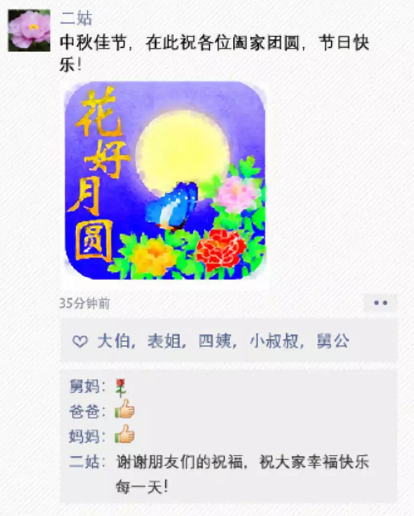还有长辈们关怀备至每一人的节日祝福+“花好月圆”配图同样到位。