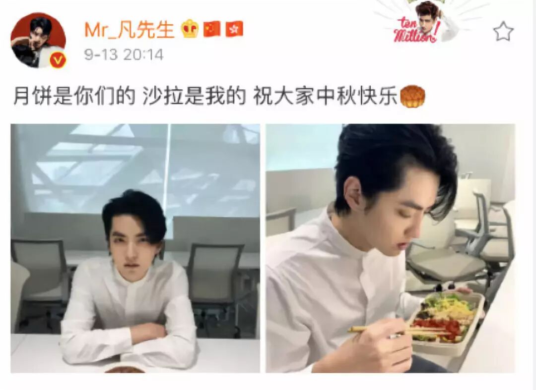 不过月饼好吃也不能吃多哦,前段时间被网友评价微微发福的吴亦凡就晒出两张照片配文:“月饼是你们的,沙拉是我的,祝大家中秋快乐。”