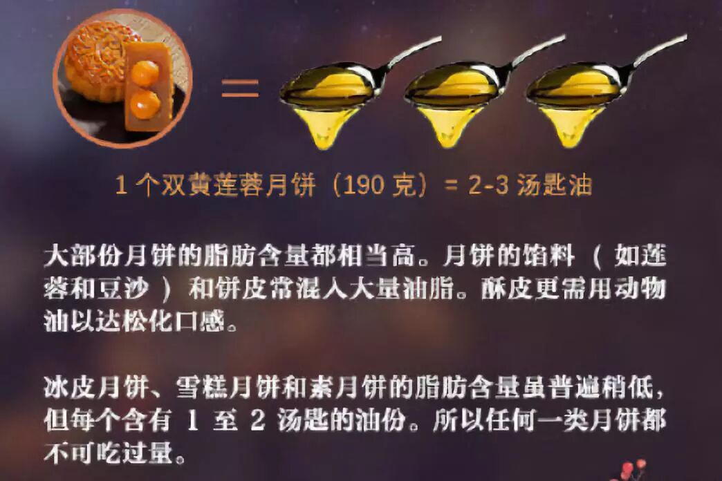 还不仅是高热量,就这样一个小小的双黄莲蓉月饼,脂肪含量更是相当于2到3汤匙油的脂肪量。