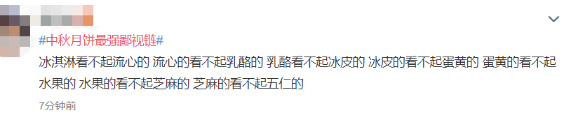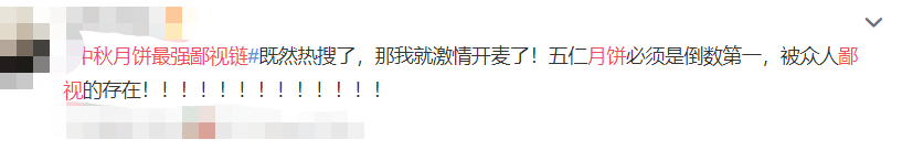 不过也有网友为“五仁”这位月饼界的大前辈“激情开麦”,表示我们五仁可是月饼界长盛不衰的红人,你们这些新晋口味再红几年才有比较资格╭(╯^╰)╮