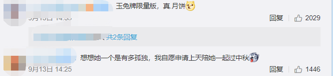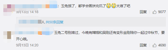 网友们看着小玉兔一个人在“天上”也是感慨良多,有的调侃玉兔是“画饼充饥”,有的拉上嫦娥、吴刚陪玉兔过中秋,鹅妹被这些有爱的评论感动到了!