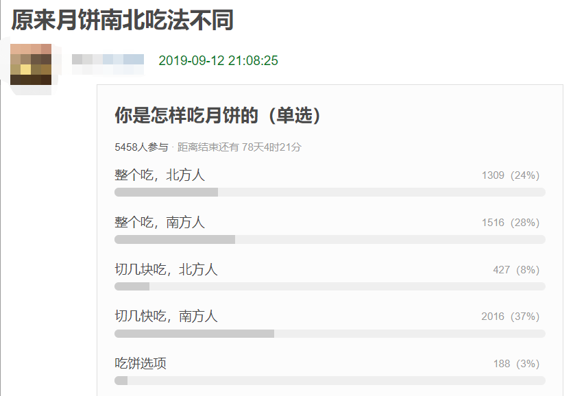 这吃月饼也是有讲究,宜少不宜多,这又引发另一个南北之争,有网友还发起了如何吃月饼的投票↓是要整个吃还是切开吃,也是一个问题。