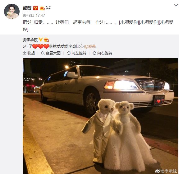 李承铉在五点二十七分发博庆祝,寓意“我爱妻”,配图车牌照上也标记了“i love 7”我爱戚。戚薇随后转发“让我们一起重来每一个5年”。