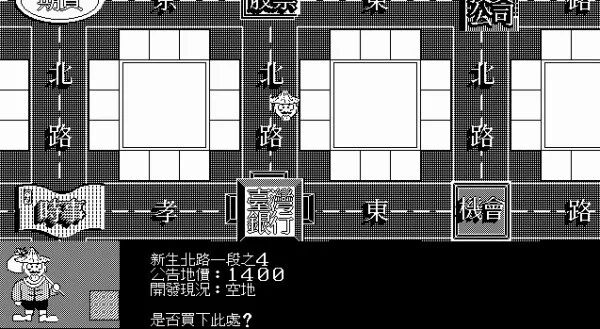 《大富翁1》的游戏画面是黑白的,游戏地图以台北市为背景,玩家可以扮演几名卡通角色中的一个,在地图上购买房产,收获财富。