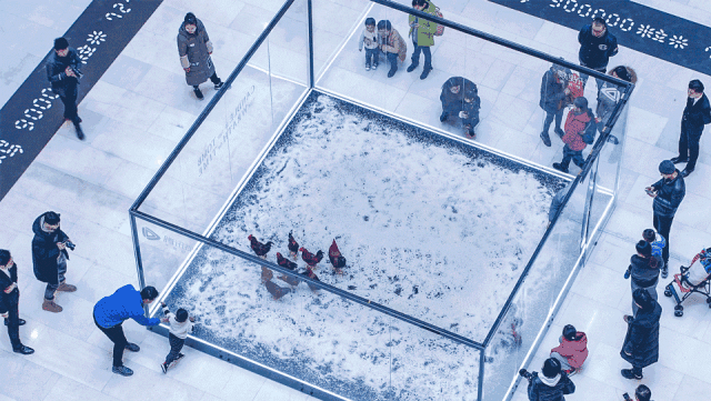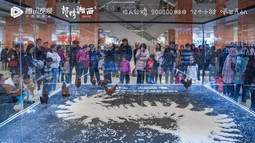 动图中,10只从中国湘西运来的“怒晴鸡”正在上海月星环球港中最繁华的地段卖力啄食900000粒大米,“啊,站在这里的不该是明星网红,帅哥美女,或者创意艺术展吗?这是什么鬼?”。还没等大家琢磨明白,现场的人群已经骚动起来,他们不仅把现场挤得水泄不通,还纷纷通过社交平台,分享各种照片、视频和各种评论。而在36kr、今日头条等新闻媒体的报道后,该事件在微博等社交媒体迅速发酵,人民网等主流网络媒体也纷纷转载,形成一轮热议潮。