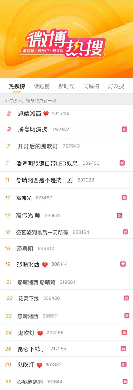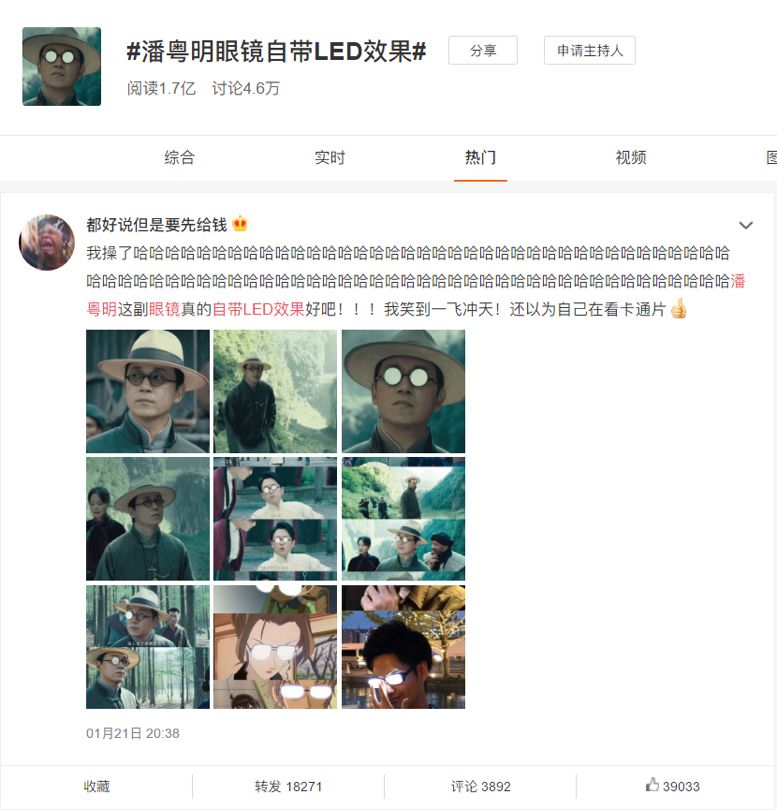 在日常的话题运营中,腾讯视频会通过生活化的内容,进一步拉近观众与剧集的距离,例如“潘粤明眼镜自带LED效果”“开灯后的鬼吹灯”等自带娱乐效果的话题加强了剧集内容的兴趣点,而“花灵下线”“昆仑下线”等重点剧情节点的讨论也加深了观众的剧集粘性,“高伟光帅”“潘粤明演技”等演员向的话题,成功吸引粉丝注意力。腾讯视频通过“剧情线”、“娱乐线”和“明星线”的多维度话题进行策略性地运营,最终实现每周都有热度、每周都有惊喜的话题延伸效果——前后共二十余次登上热搜榜。