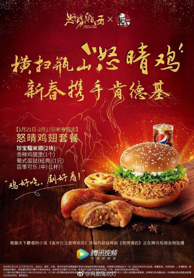 营销中,每一步都要起到相应的影响力,而这影响力无外乎人和行为,而鸡就是《怒晴湘西》宣传中的“人”,“啄出天机”和“送鸡上天”则是行为,也就是所谓的营销事件。前者让大众了解怒晴鸡,后者让人知道这只鸡是有梦想的,是有性格的,甚至是自带“鸡血”的。打造强标签记忆的同时激发大众对剧集本身的热情,而与肯德基的BD合作——推出怒晴鸡翅套餐,更是有“原来你也在这里”的天然话题点和记忆点,既增加了剧集传播的趣味性与覆盖面,也为肯德基的限定产品带来了新思路与活力。