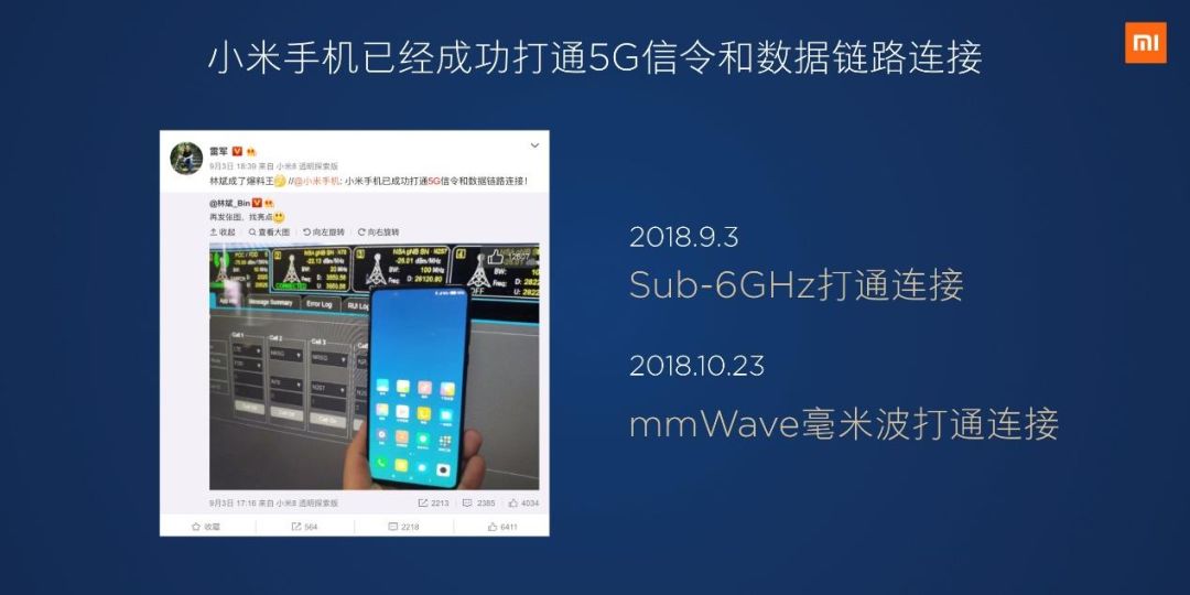 小米一直非常重视技术的探索与创新。早在2016年,小米就成立了5G预研团队,提前对5G标准展开全面深入研究工作;2017年初,小米正式启动5G手机的设计;2018年9月,小米率先打通5G的信令和数据链路连接,为5G商用奠定基石。