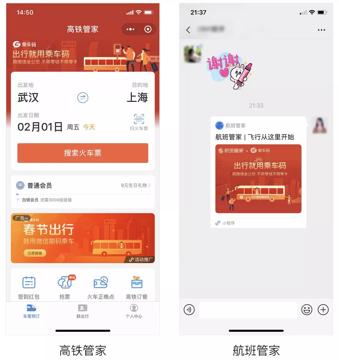 每年春节,春运都是重头戏,半个中国的人都会卷入其中,影响力之大是一般节点不能比拟的。乘车码考虑到“春运最后一公里”的刚需,联合高铁管家及航班管家——春节返乡人群最常使用的小程序应用之一进行小程序互选广告定制。通过小程序互选定制广告,让人们在返乡后享受“扫码乘车”服务。而春运中多维度的出行需要,也让品牌信息在特定场景下有了更多曝光可能。