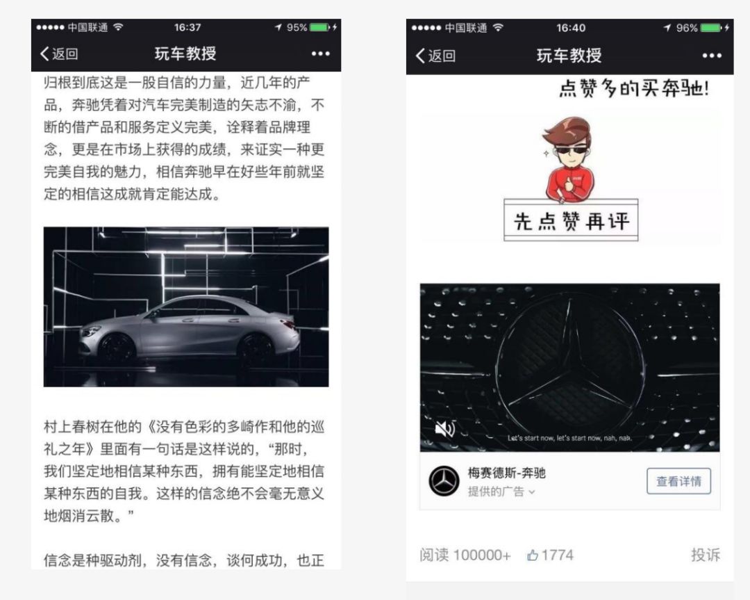 广告主经常有这样的困惑,到底哪些号的内容是最好的?或者说最适合我的,转化率如何?性价比如何?甚至排期都会是品牌所要牵肠挂肚的。于是越来越多的品牌选择直接互选广告,奔驰就是其中之一,与玩车教授的跨界合作,不仅带来8%的平均点击率、56%的相关评论,并将“心所向,驰以恒”的品牌主张通过别开生面的嘻哈视频触达了更多粉丝人群。