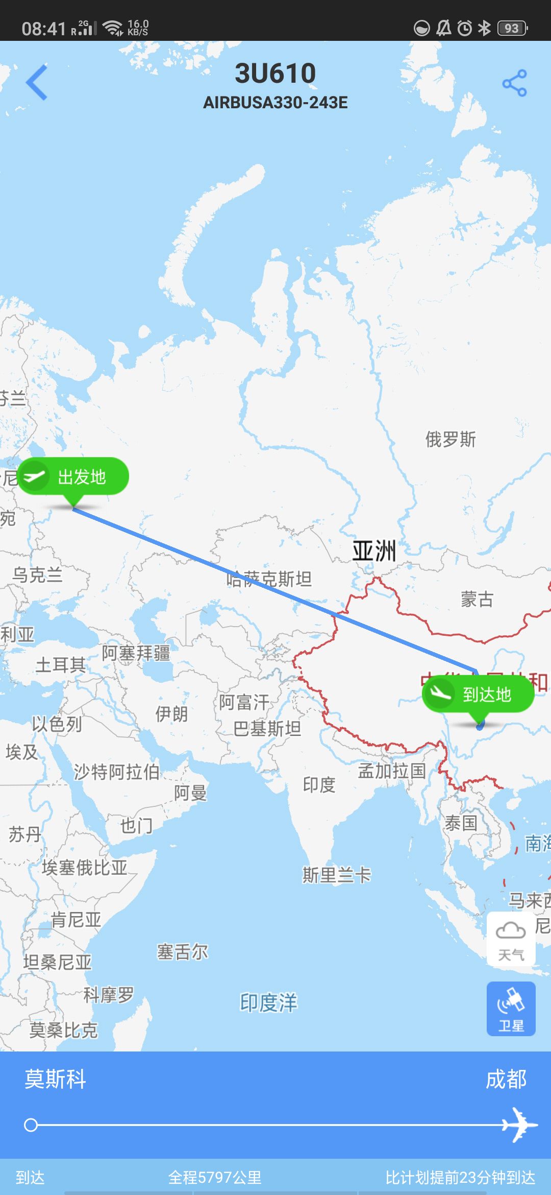 2018年1月7号: 3U0610 莫斯科-成都里程5784公里