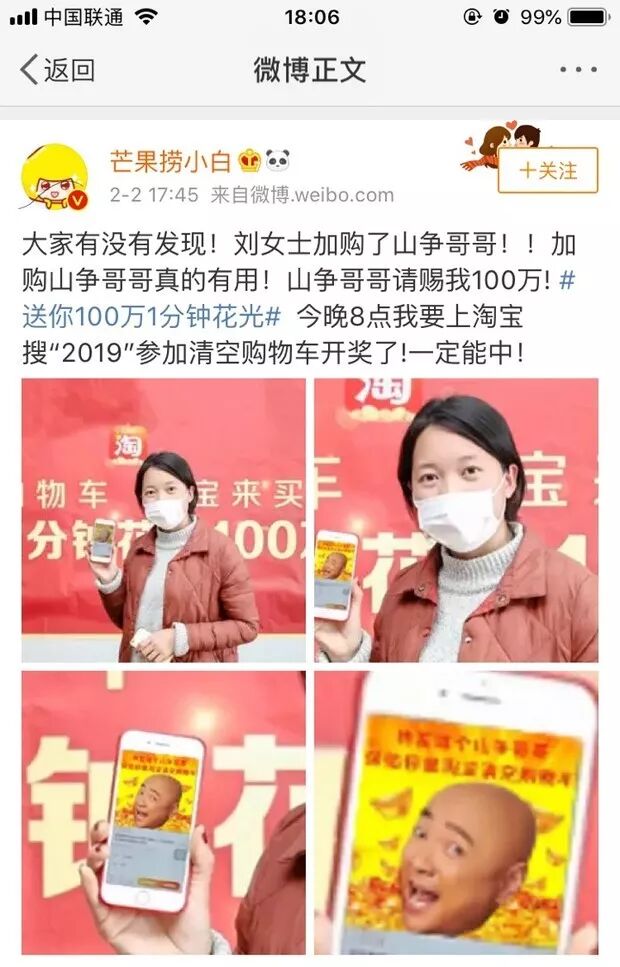 最会玩的还要数把淘宝新春送喜官徐峥作为幸运商品“上架”了,截止目前销量已破170万,可以说是2019第一爆款了。据说刘女士就是在昨晚加购了这个商品之后才被清空。
