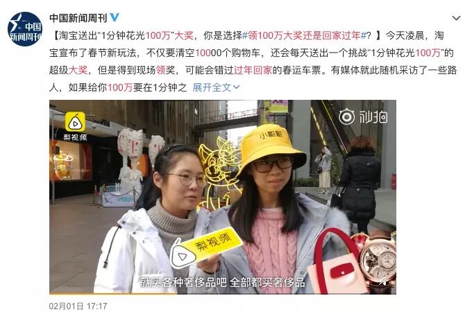 - 在各大品牌集福活动进行得风风火火之时,淘宝“挑战1分花光100万”的活动昨日刷屏朋友圈,同时也终于迎来了第一位幸运儿——来自广东惠州的刘女士。 △昨天喜提淘宝清空购物车大奖的刘女士差点放弃100万