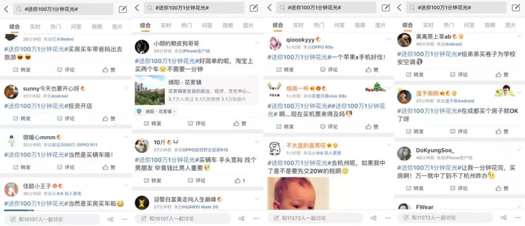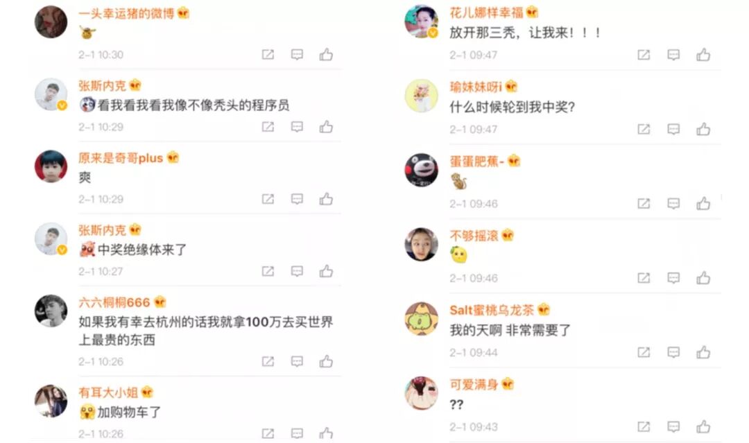 淘宝“挑战1分钟花光100万”的活动在延续IP性的同时,很巧妙地用一个挑战制造了超级话题:怎么才能中奖?中奖了怎么花?怎么提高加购的手速把100万花到极致?…网友们围绕一夜暴富的猜想,总让人忍不住感慨“智慧在民间”!