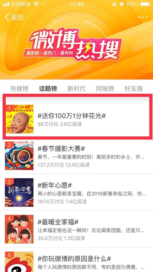 从去年与春晚合作,清空1000个购物车,登上微博热搜榜,淘宝用实打实的福利在春节营销中脱颖而出。今年#送你100万1分钟花光#又超过24小时占据微博热门榜首位。