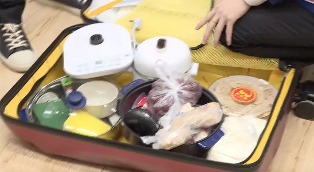 比如有的人箱子里装着一箱零食,而隔壁的苏勋伦带了一箱子养生食材和电饭锅,搭配保温杯+枣毫无违和感。