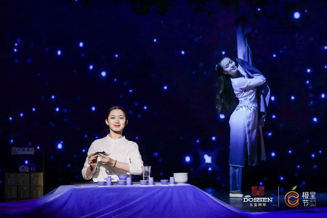 “思”体验区的现代舞演员在“浩瀚无垠的宇宙星空”中环绕茶艺师翩翩起舞,茶艺师神定气闲地泡茶分汤。表演结束后观众可进入体验区内品茶香,悟人生。