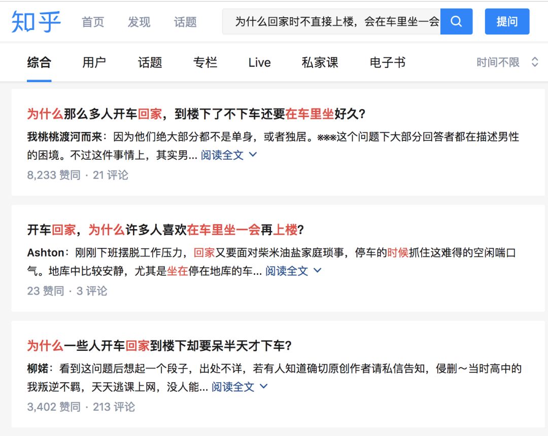 知乎热门话题#为什么回家时不直接上楼,要在车里坐一会#一度刷屏朋友圈,网友一句“刚刚下班摆脱工作压力,回家又要面对柴米油盐的家庭琐事”道出真相。