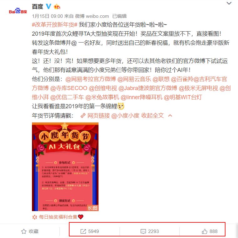1月15日,百度的官微忽然发布了“小度年货节”的推文,并且通过艾特网易考拉、网易云音乐、联想、百雀羚等14家品牌官微联合造势,通过寻找锦鲤,赠送2019年春节超级“AI大礼包”的形式,在社交媒体上引发了广泛关注,截止1月17日,转发近6000次,数百万人关注,这几乎是百度其它推文的2、30倍。