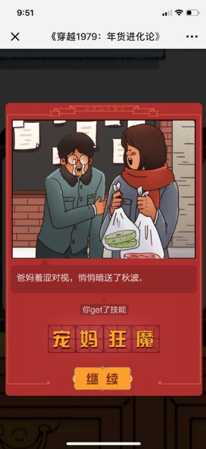 3、激发自传播,内容为王。如果把好玩类的H5看作一个游戏的话,那么游戏的内容架构一定是这个H5的灵魂。穿越的内容设计新潮,也是容易引起年轻人兴趣的内容;通过“穿越”,巧妙的把79、89、99、09、19,四十年来人们对年货所折射的时代特征巧妙又很有洞察的总结出来。穿越的路径也分别以十年为节点,设置了不同的选项,不同的选项指向不同的内容发展路径,也通过用户的不同选择,及时反馈给出一个心理测试结果。而个性评估几乎又是绝大多数用户都无法拒绝的诱惑(这也是星座、性格之类的心理评估内容拥有广泛受众的根本原因),每一个测试结果都用极具网络文化的标签来定义,让用户既有文化共鸣,又觉得好玩过瘾。因此,内容自然就容易在用户那边收获高分,引发分享。